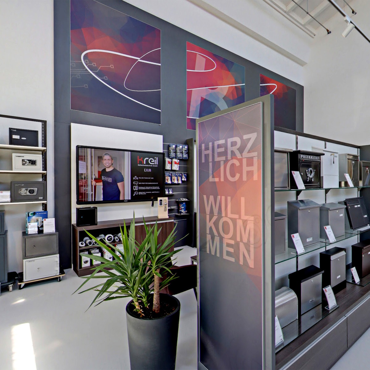 Das Branding endet nicht beim Logo: Die visuelle Sprache zieht sich konsequent durch die neuen Räumlichkeiten, so transportieren großformatige, künstlerische Flächen die Marke in den Raum. Es entstand ein durchgängiger Auftritt, der funktionale Sicherheit mit gestalterischem Anspruch verbindet – klar, modern und mit starker Wiedererkennung.
