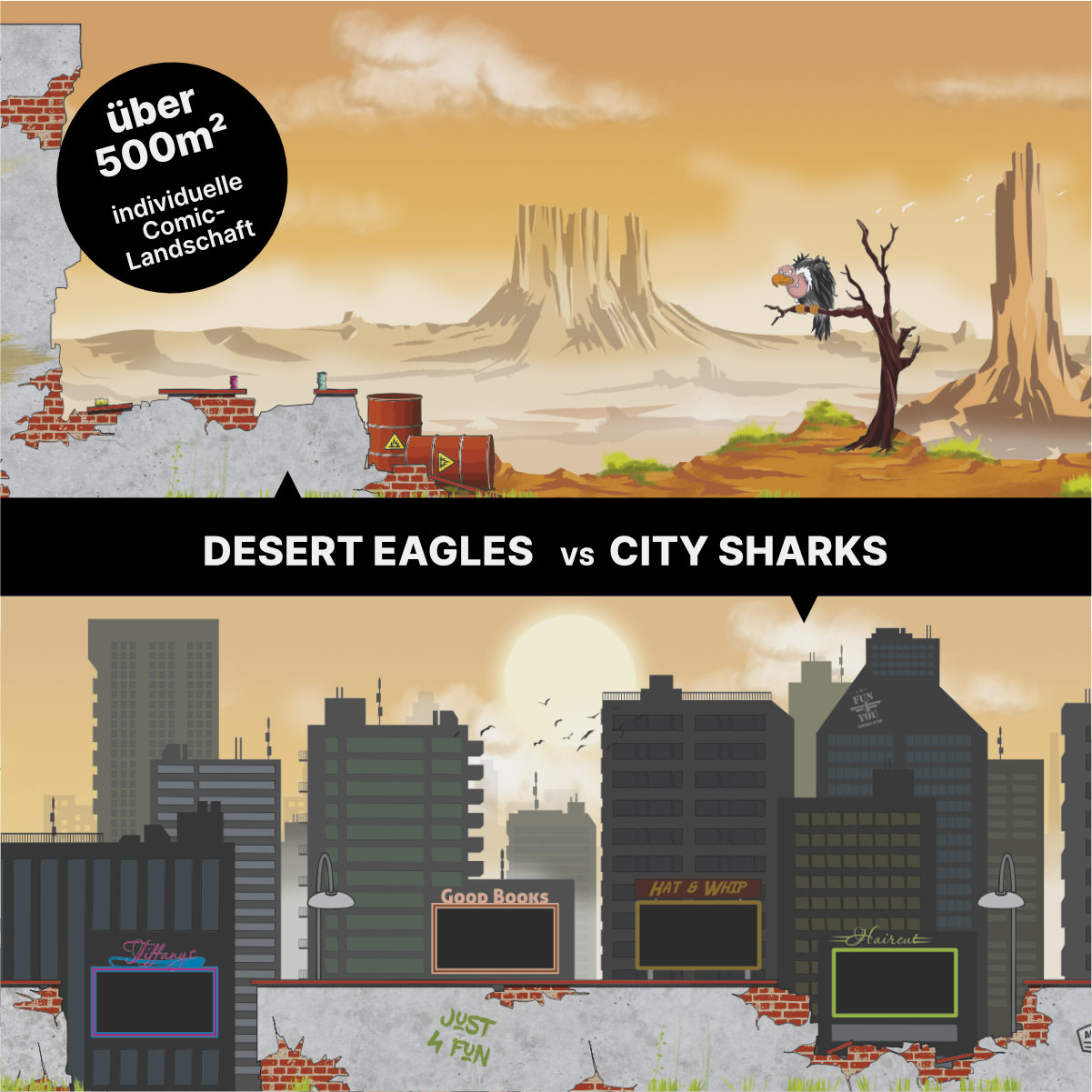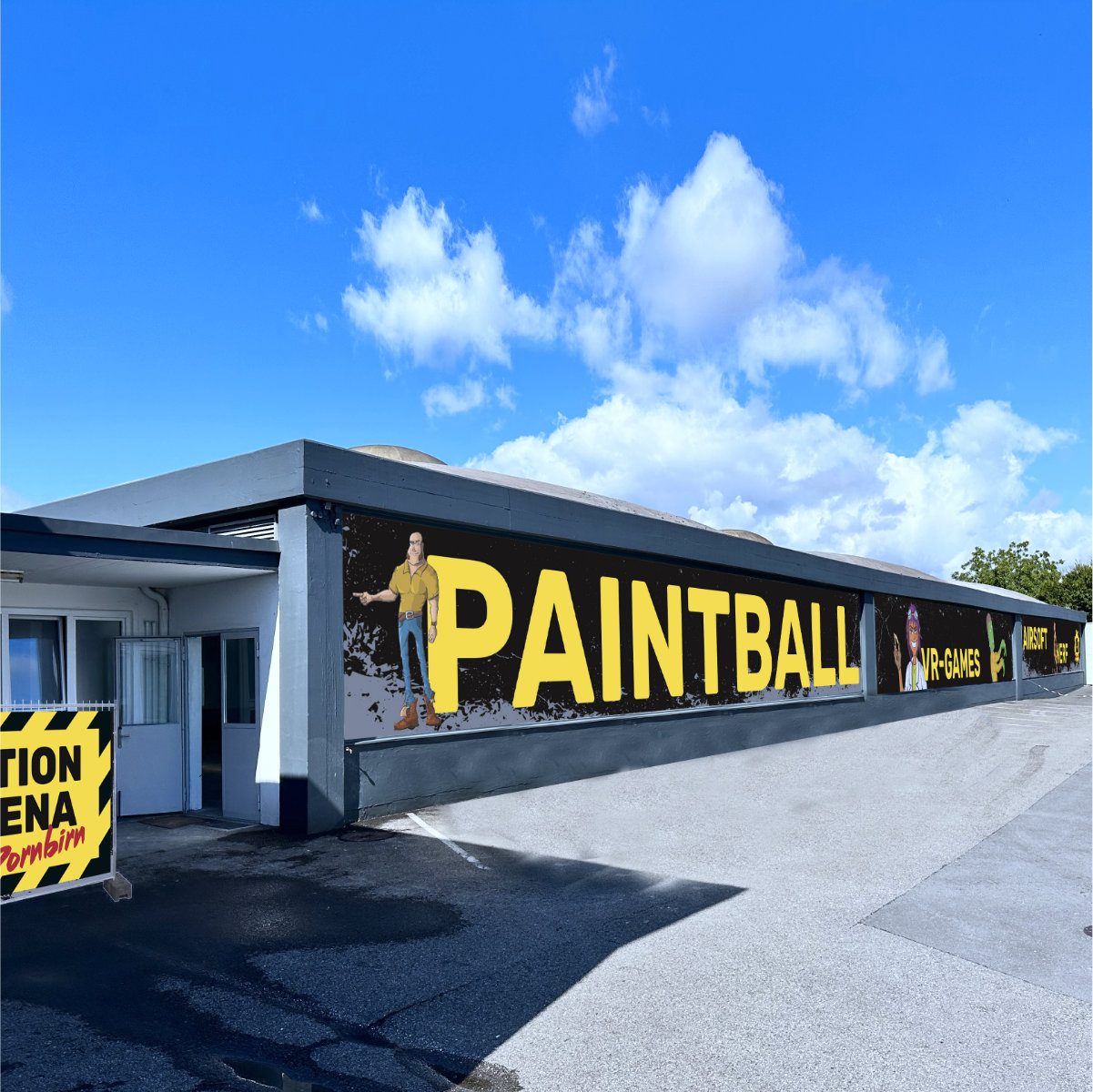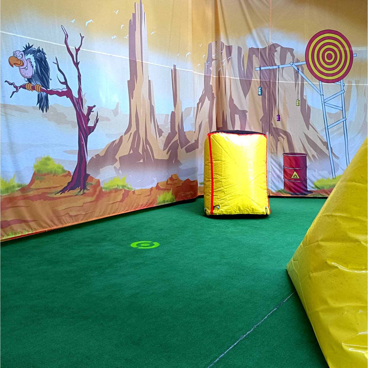 Für die Paintball-Arena entstand eine über 500 m² große, immersive Comic-Landschaft mit zwei kontrastierenden Spielwelten: Stadt und Wüste. Die urbane Seite wurde zusätzlich mit integrierten Sichtfenstern konzipiert, die es Zuschauern ermöglichen, das Geschehen von außen mitzuverfolgen – ohne direkt ins Spielgeschehen einzugreifen.